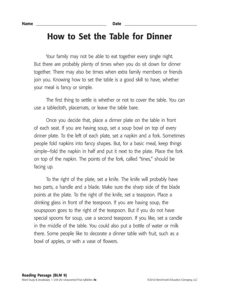 Name Date How to Set the Table for Dinner Your family may not be able to eat together every single night. But there are probably plenty of times when you do sit down for dinner together. There may