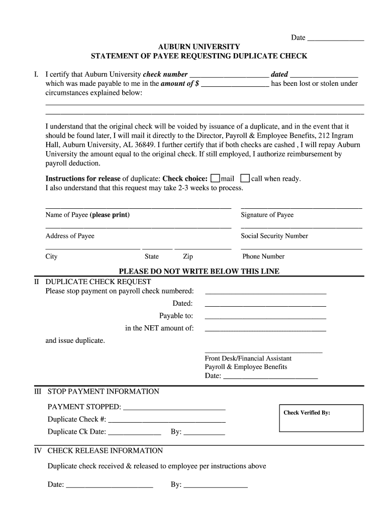 RESET FORM Date AUBURN UNIVERSITY STATEMENT OF PAYEE REQUESTING DUPLICATE CHECK I. I certify that Auburn University check number dated which was made payable to me in the amount of $ has been lost