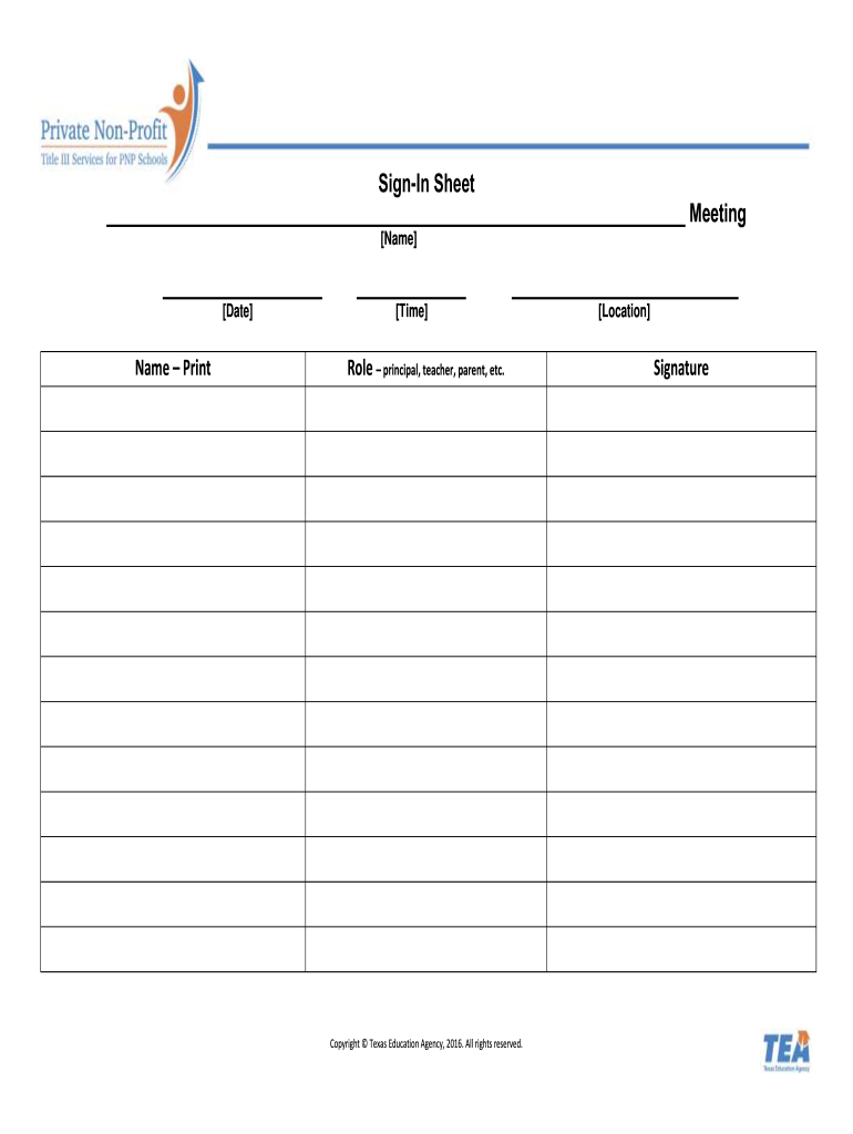 Signing Sheet Meeting Name Date Name Print Time Location Role principal, teacher, parent, etc. Copyright Texas Education Agency, 2016. All rights reserved. Signature