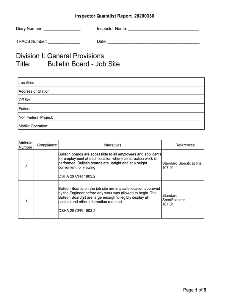 Inspector Quantity Report 20200330 Diary Number: Inspector Name: TRACK Number: Date: Division I: General Provisions Title: Bulletin Board Job Site Location: Address or Station: Off Set: Federal: Non