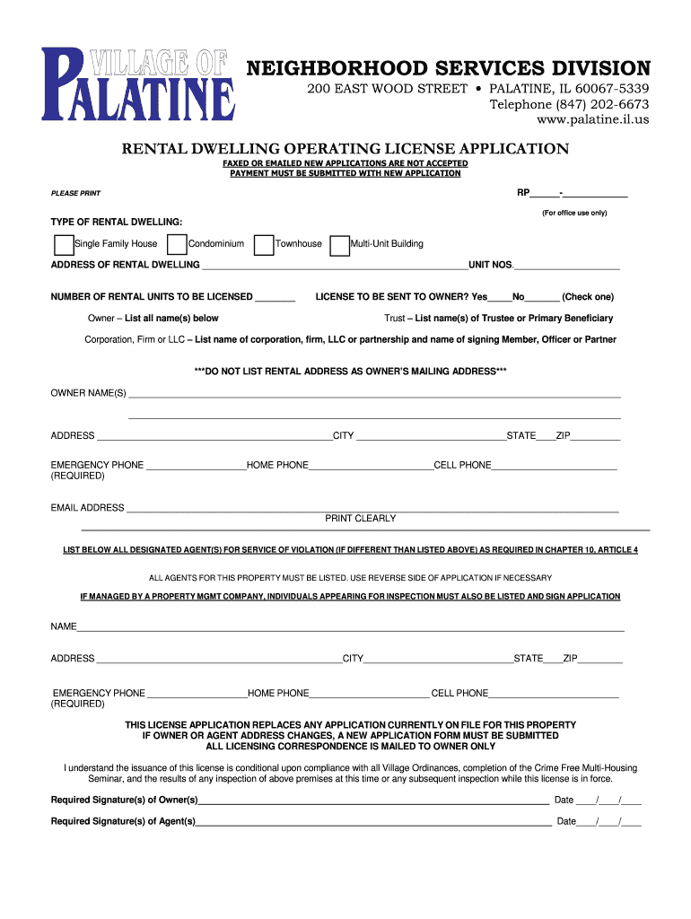 NEIGHBORHOOD SERVICES DIVISION 200 EAST WOOD STREET PALATINE, IL 600675339 Telephone (847) 2026673 Fax (847) 7764733 www.palatine.il.us2020 Licensing and Inspection Requirements for Residential Rental