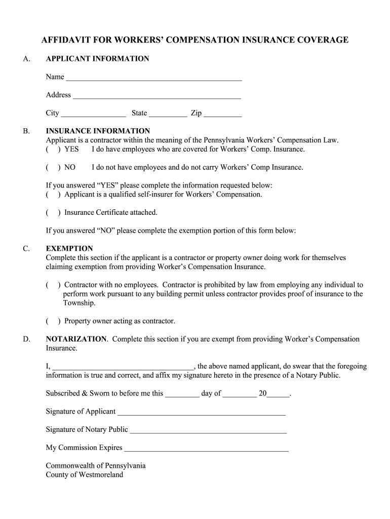 AFFIDAVIT FOR WORKERS COMPENSATION INSURANCE COVERAGE A.APPLICANT INFORMATION Name Address City State Zip B.INSURANCE INFORMATION Applicant is a contractor within the meaning of the Pennsylvania Workers