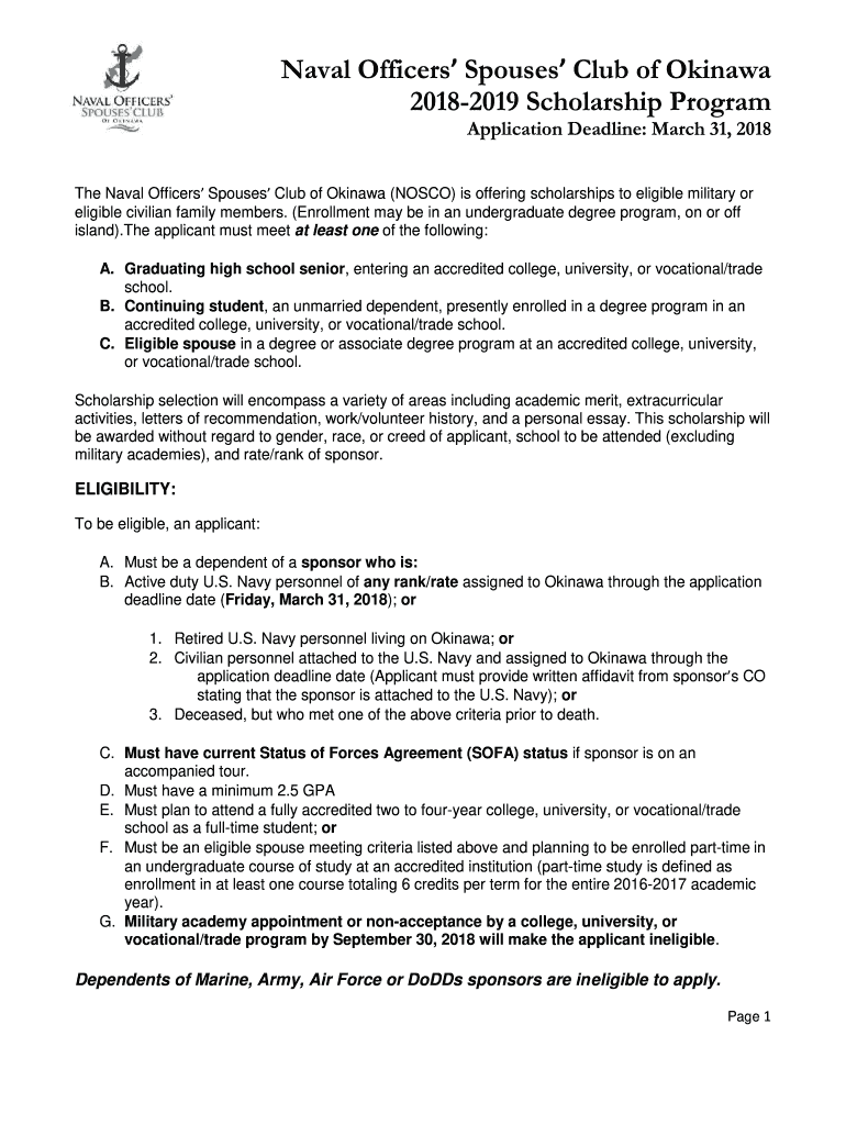 20182019 Scholarship ProgramApplication Deadline: March 31, 2018The Naval Officers Spouses Club of Okinawa (NO SCO) is offering scholarships to eligible military