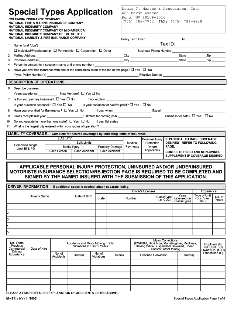 The Special Types Application is a crucial document that facilitates the process of obtaining insurance coverage for businesses. It serves as the primary insurance application form that organizations, including those under Columbia Insurance Company, utilize when seeking necessary protection for their operations. This form encompasses essential details about business activities and vehicle use, which are critical for insurance underwriting.