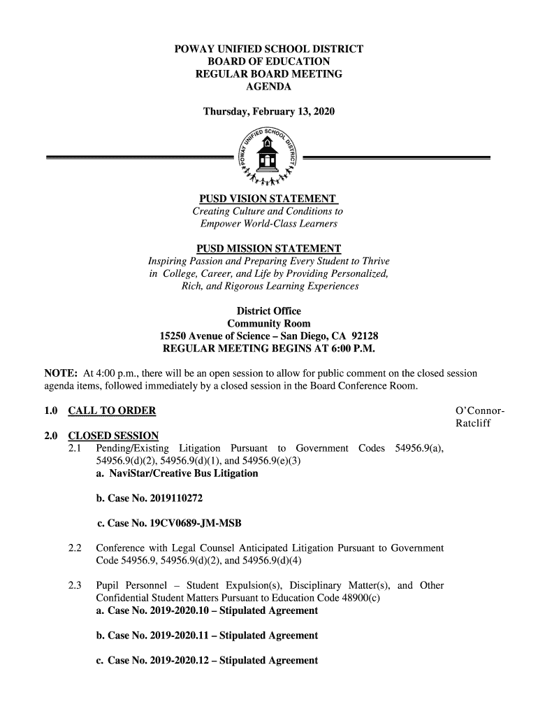 NOWAY UNIFIED SCHOOL DISTRICT BOARD OF EDUCATION REGULAR BOARD MEETING AGENDA Thursday, February 13, 2020PUSD VISION STATEMENT Creating Culture and Conditions to Empower Wordless Learners PUSH MISSION