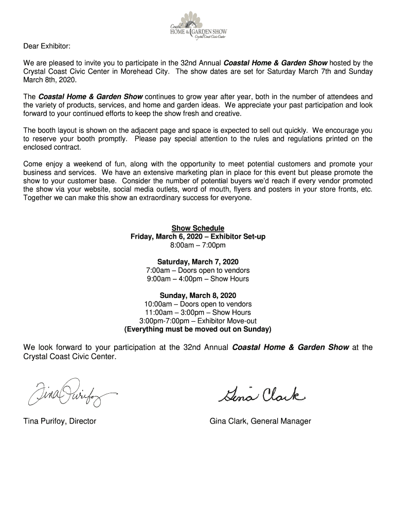 Dear Exhibitor: We are pleased to invite you to participate in the 32nd Annual Coastal Home & Garden Show hosted by the Crystal Coast Civic Center in Forehead City. The show dates are set for Saturday,