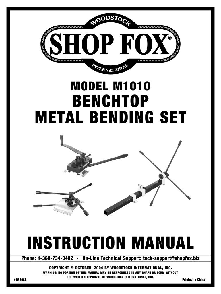 MODEL M1010BENCHTOP METAL BENDING INSTRUCTION MANUAL Phone: 13607343482 Online Technical Support: tech support shop fox.biz COPYRIGHT OCTOBER 2004 BY WOODSTOCK INTERNATIONAL, INC. #6586CRWARNING: