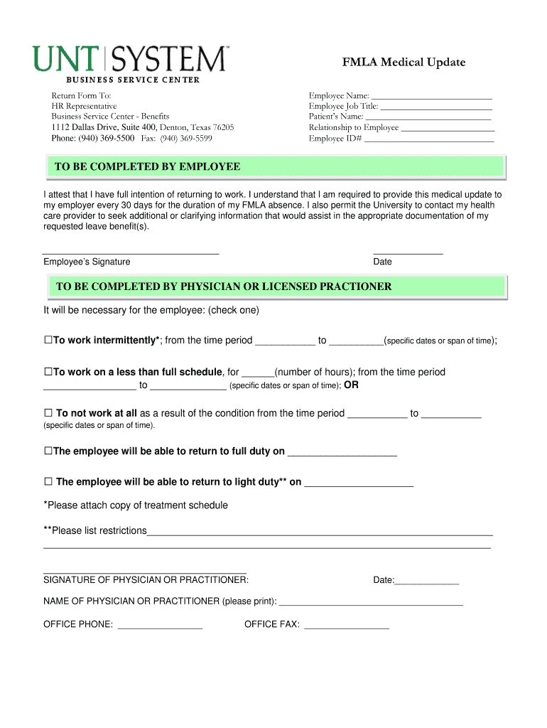 The FMLA Medical Update Form is typically used by employees currently on Family and Medical Leave. It requires input from the employee and a physician or practitioner attesting to their work status.