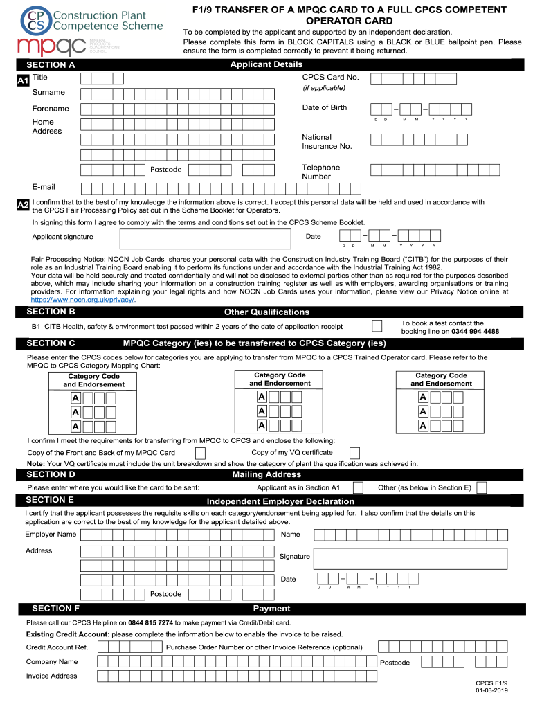 Get the free F1/9 TRANSFER OF A MPQC CARD TO A FULL CPCS COMPETENT