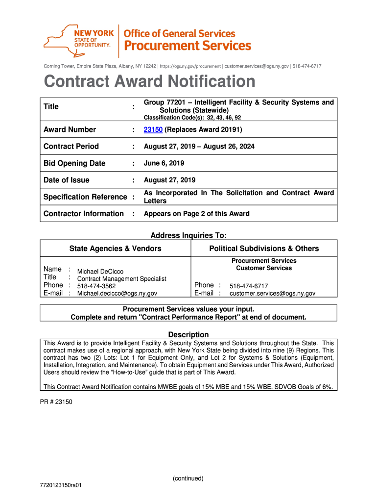 Corning Tower, Empire State Plaza, Albany, NY 12242 https://ogs.ny.gov/procurement customer.services dogs.NY.gov 5184746717Contract Award Notification Title:Group 77201 Intelligent Facility & Security