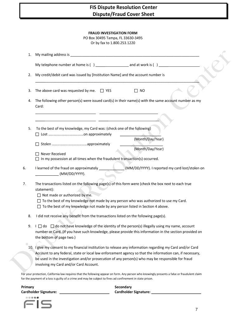 The FIS Fraud Investigation Form is intended for cardholders who have experienced unauthorized transactions or fraudulent activity on their credit or debit cards.