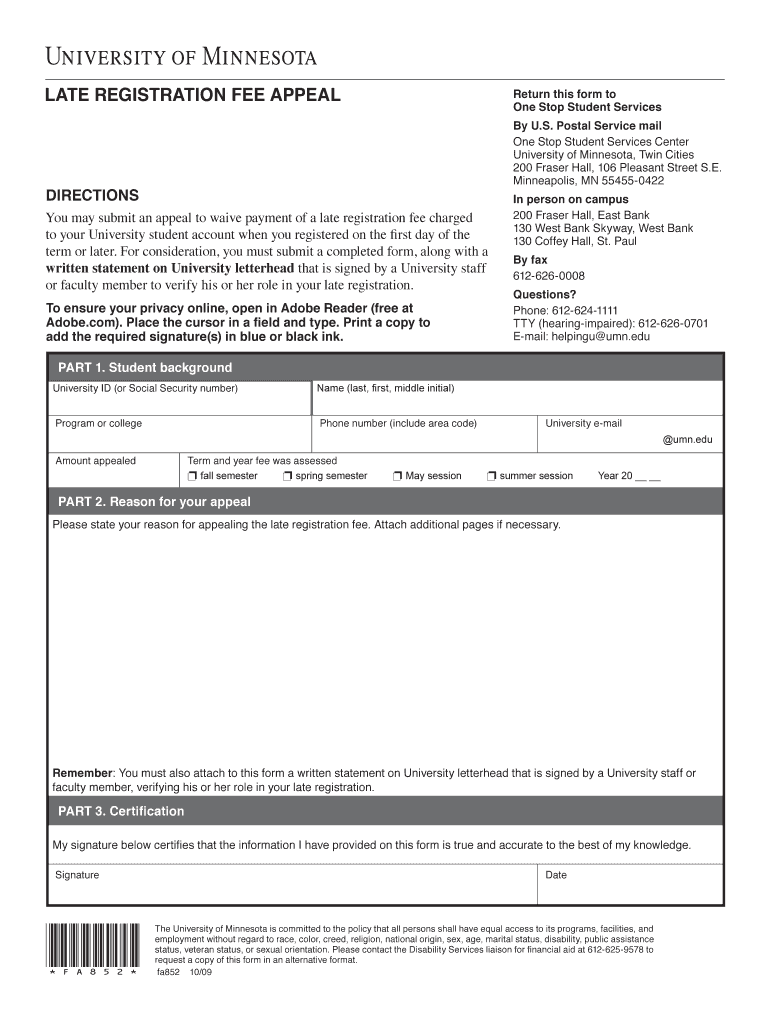 The Late Registration Fee Appeal Form is a financial aid application used by students at the University of Minnesota to request a waiver for late registration fees.