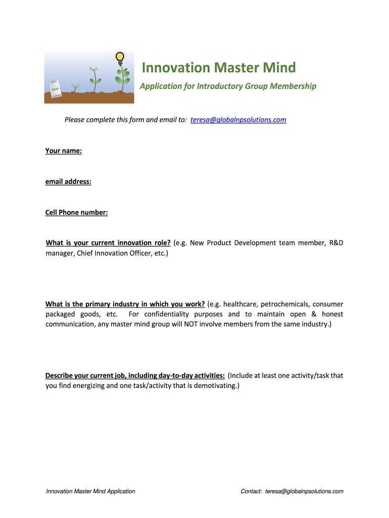 Innovation Master Mind Application for Introductory Group MembershipPlease complete this form and email to: Teresa globalnpsolutions. Contour name:email address:Cell Phone number:What is your current