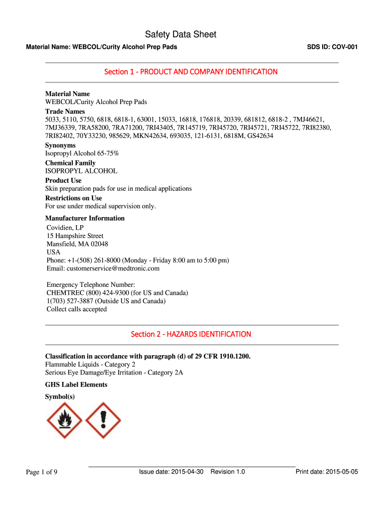 Safety Data Sheet Material Name: WEB COL/Purity Alcohol Prep Passes ID: COV001Section 1 PRODUCT AND COMPANY IDENTIFICATION Material Name WEB COL/Purity Alcohol Prep Pads Trade Names 5033, 5110, 5750,