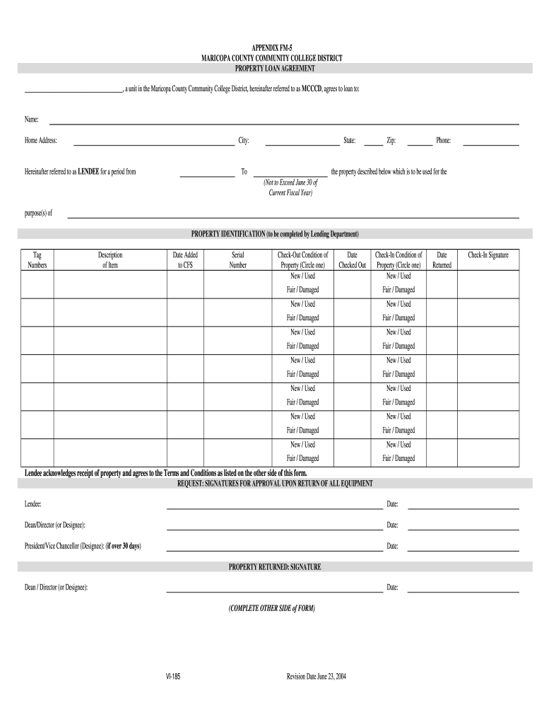 APPENDIX FM5 MARICOPA COUNTY COMMUNITY COLLEGE DISTRICT PROPERTY LOAN AGREEMENT, a unit in the Maricopa County Community College District, hereinafter referred to as MC CCD, agrees to loan to:Name: