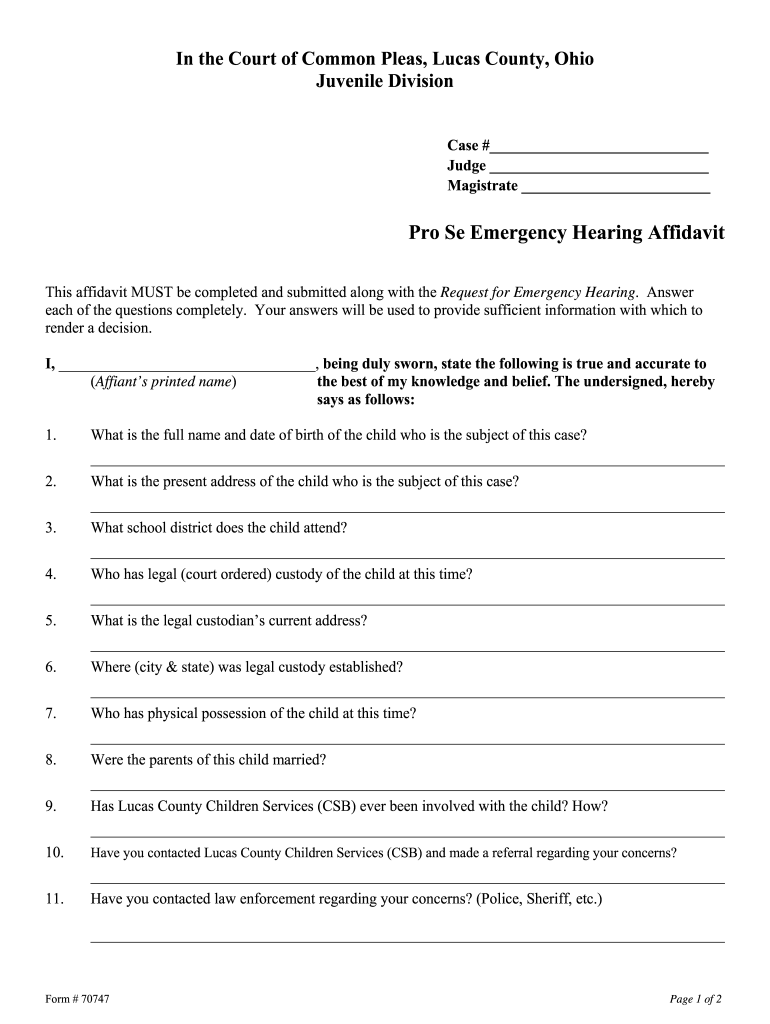 In the Court of Common Pleas, Lucas County, Ohio Juvenile Division Case # Judge Magistrate Pro Se Emergency Hearing Affidavit This affidavit MUST be completed and submitted along with the Request