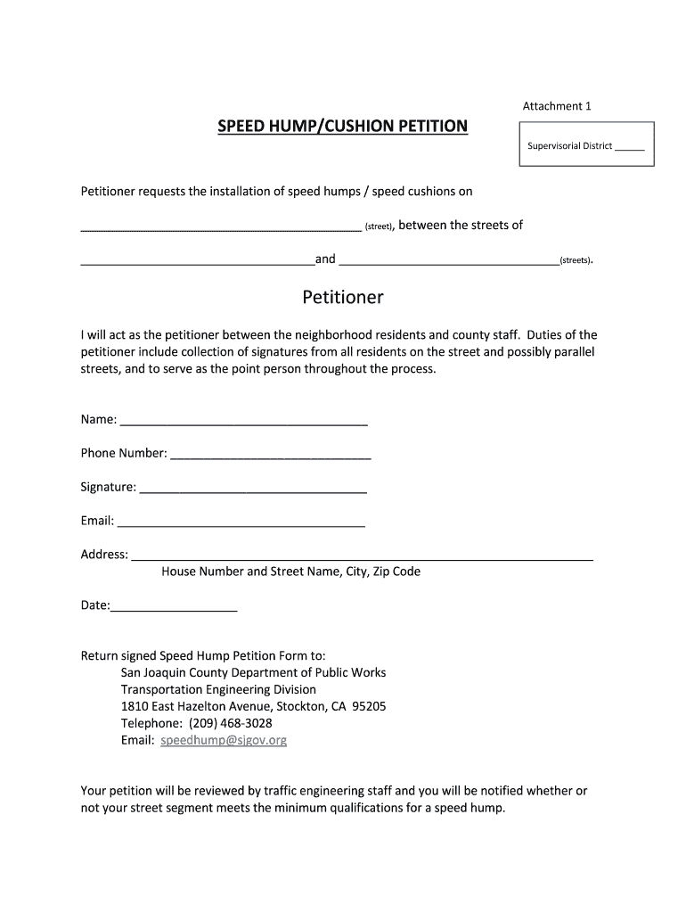 SPEED HUMP/CUSHION PETITIONAttachment 1 Supervisor District Petitioner requests the installation of speed humps / speed cushions on (street), between the streets of and (streets). Petitioner I will