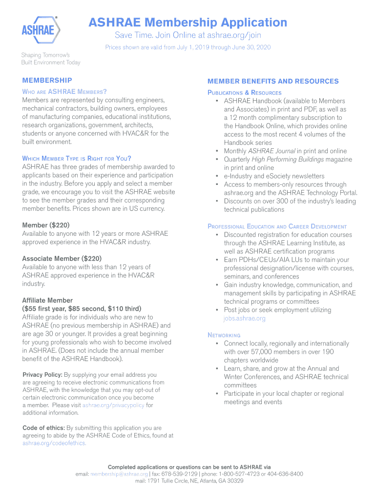 ASHRAE Membership Application Save Time. Join Online at ashrae.org/join Prices shown are valid from July 1, 2019, through June 30, 2020MEMBERSHIPMEMBER BENEFITS AND Resources are ASHRAE Members? Members