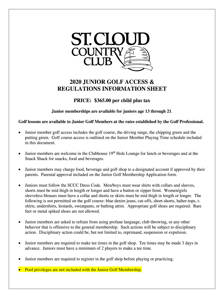 2020 JUNIOR GOLF ACCESS & REGULATIONS INFORMATION SHEET PRICE: $365.00 per child plus tax Junior memberships are available for juniors age 13 through 21. Golf lessons are available to Junior Golf