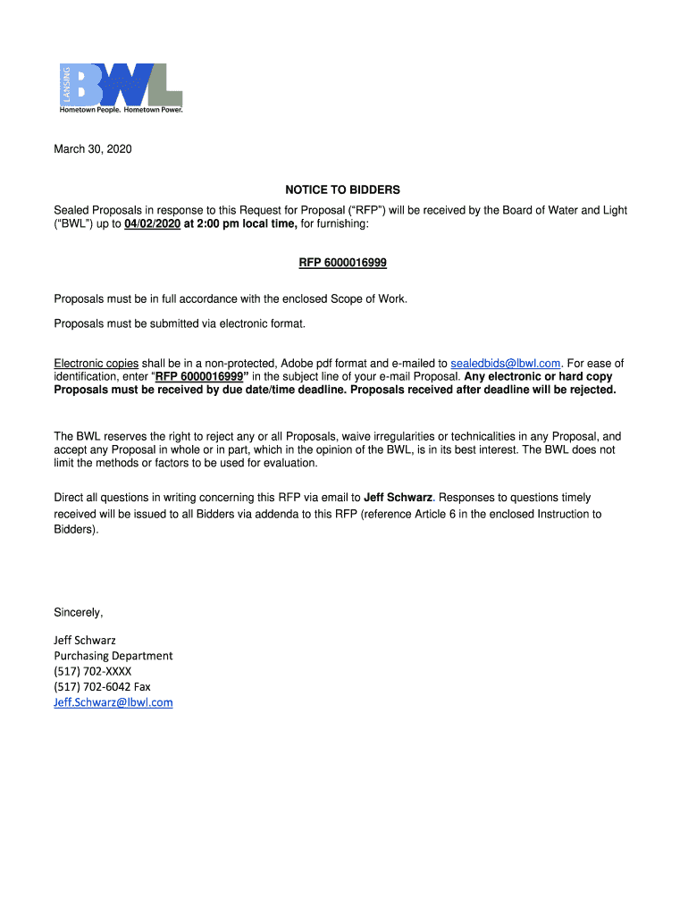 Sealed Proposals in response to this Request for Proposal (RFP) will be received by the Board of Water and Light