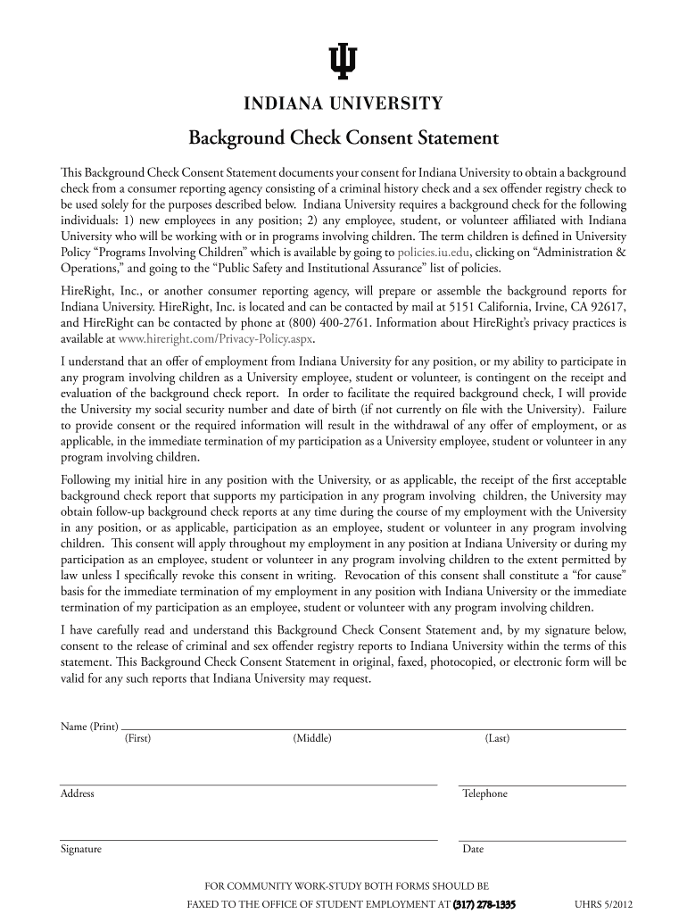 The Background Check Consent Statement is a legal document used by Indiana University to obtain consent from applicants for comprehensive background checks.