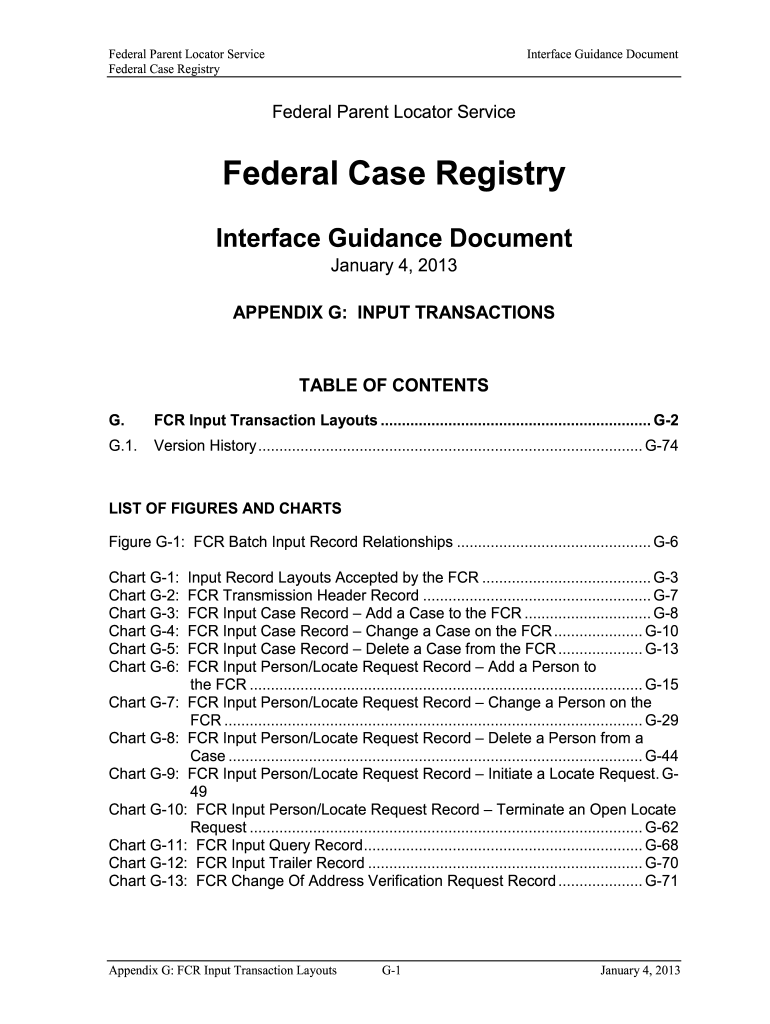 Federal Parent Locator Service Federal Case RegistryInterface Guidance Document Federal Parent Locator Service Federal Case Registry Interface Guidance Document January 4, 2013APPENDIX G: INPUT TRANSACTIONSTABLE