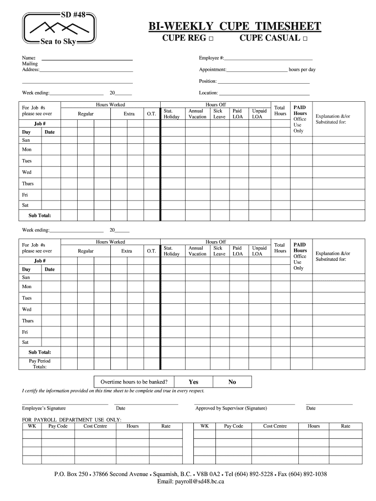 BIWEEKLY CUP TIMESHEET CUP REG CUP CASUAL Name: Mailing Address: Employee #: Position:Week ending: Location:Appointment:20 Hours Worked Job #s please see overRegularExtrahours per day. T. Stat. HolidayHours