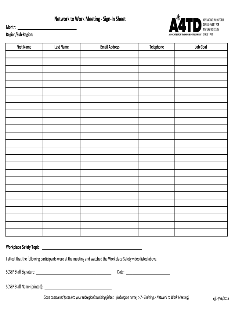 Network to Work Meeting Signing Sheet Month: Region/SubRegion: First Nameless NameEmail AddressTelephoneJob GoalWorkplace Safety Topic: I attest that the following participants were at the meeting