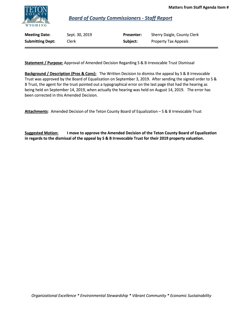 Matters from Staff Agenda Item #Board of County Commissioners Staff Report Meeting Date: Submitting Dept:Sept. 30, 2019 ClerkPresenter: Subject:Sherry Dangle, County Clerk Property Tax AppealsStatement