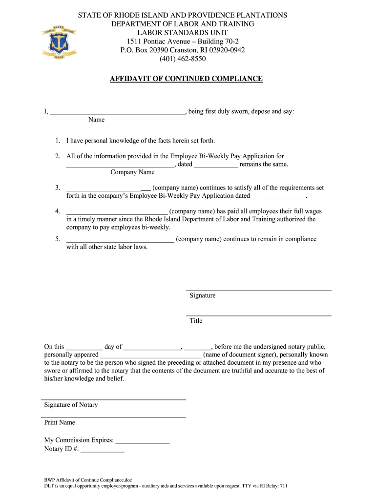 STATE OF RHODE ISLAND AND PROVIDENCE PLANTATIONS DEPARTMENT OF LABOR AND TRAINING LABOR STANDARDS UNIT 1511 Pontiac Avenue Building 702 P.O. Box 20390 Cranston, RI 029200942 (401) 4628550 AFFIDAVIT