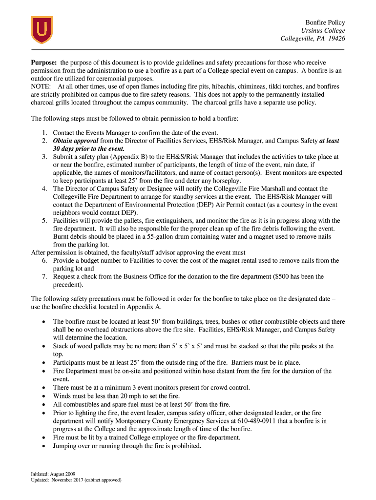 Bonfire Policy Your sinus College Collierville, PA 19426 Purpose: the purpose of this document is to provide guidelines and safety precautions for those who receive permission from the administration