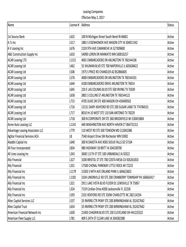 Leasing Companies Effective May 2, 2017, NameLicense # AddressStatus1st Source Bank 4 J's Inc A V Leasing Inc A&E Construction Supply Inc CAR Leasing LTD CAR Leasing Ltd CAR Leasing Ltd CAR Leasing