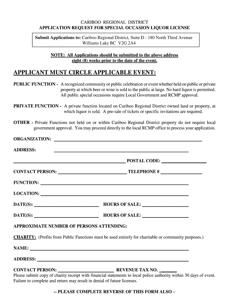 CARIBOU REGIONAL DISTRICT APPLICATION REQUEST FOR SPECIAL OCCASION LIQUOR LICENSE Submit Applications to: Caribou Regional District, Suite D 180 North Third Avenue Williams Lake BC V2G 2A4 NOTE: All