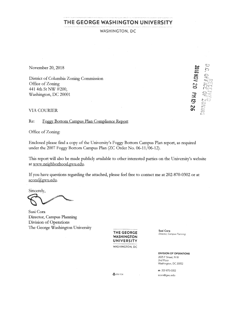 THERE WASHING 'ON UNIVERSITY November 20, 2018, District of Columbia Zoning Commission Office of Zoning 441 4th St NW #200, Washington, DC 20001 '! '/(' ') c,r11 ,,,;VIA COURIER Re:Foggy Bottom Campus