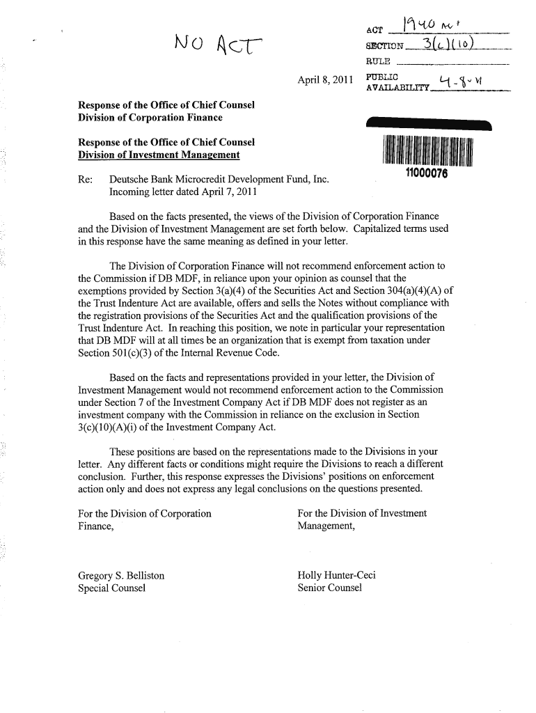 Tract 4cESCFIUN RULE April82011of response Division of therein thisManagementDeutscheBankMicrocreditIncomingletterdatedand the Division responseTheDBexemptions provided the Trust Indenture the registration
