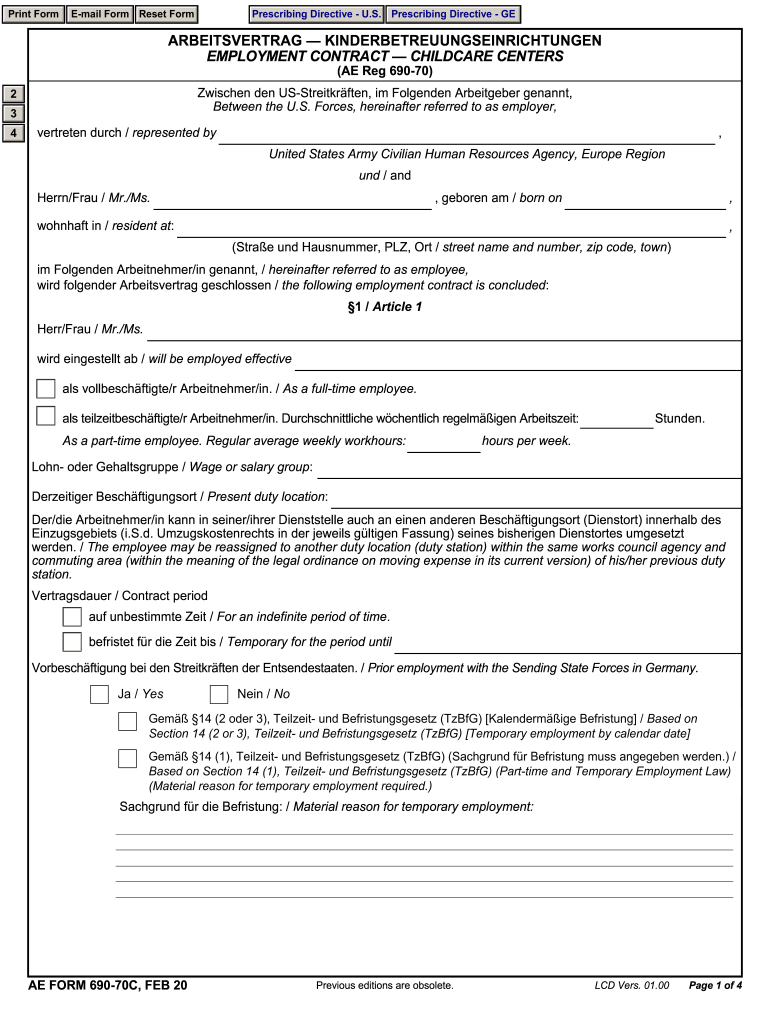 Get the free AE Form 690-70C, February 2020 (LCD Vers. 01.00). ArbeitsvertragKinderbetreuungseinr...