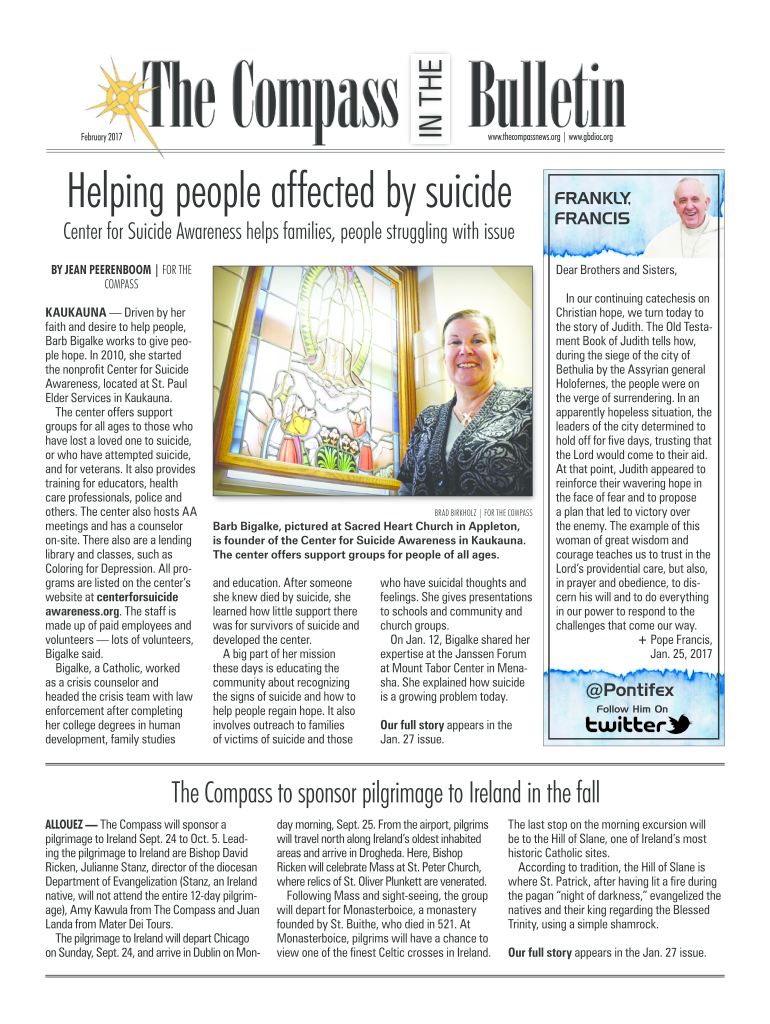IN THE February 2017www.thecompassnews.org www.gbdioc.orgHelping people affected by suicideCenter for Suicide Awareness helps families, people struggling with issue By Jean Yearbook For The Compass
