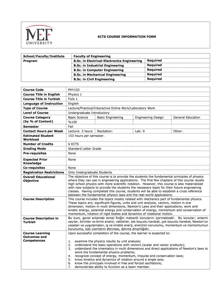 Get the free ECTS COURSE INFORMATION FORM Program B.Sc. in Electrical ...