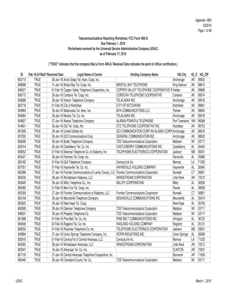 Appendix M05 2Q2016 Page 1 of 86 Telecommunications Reporting Worksheet, FCC Form 499Q Due February 1, 2016, Worksheets received by the Universal Service Administrative Company (USA) as of February