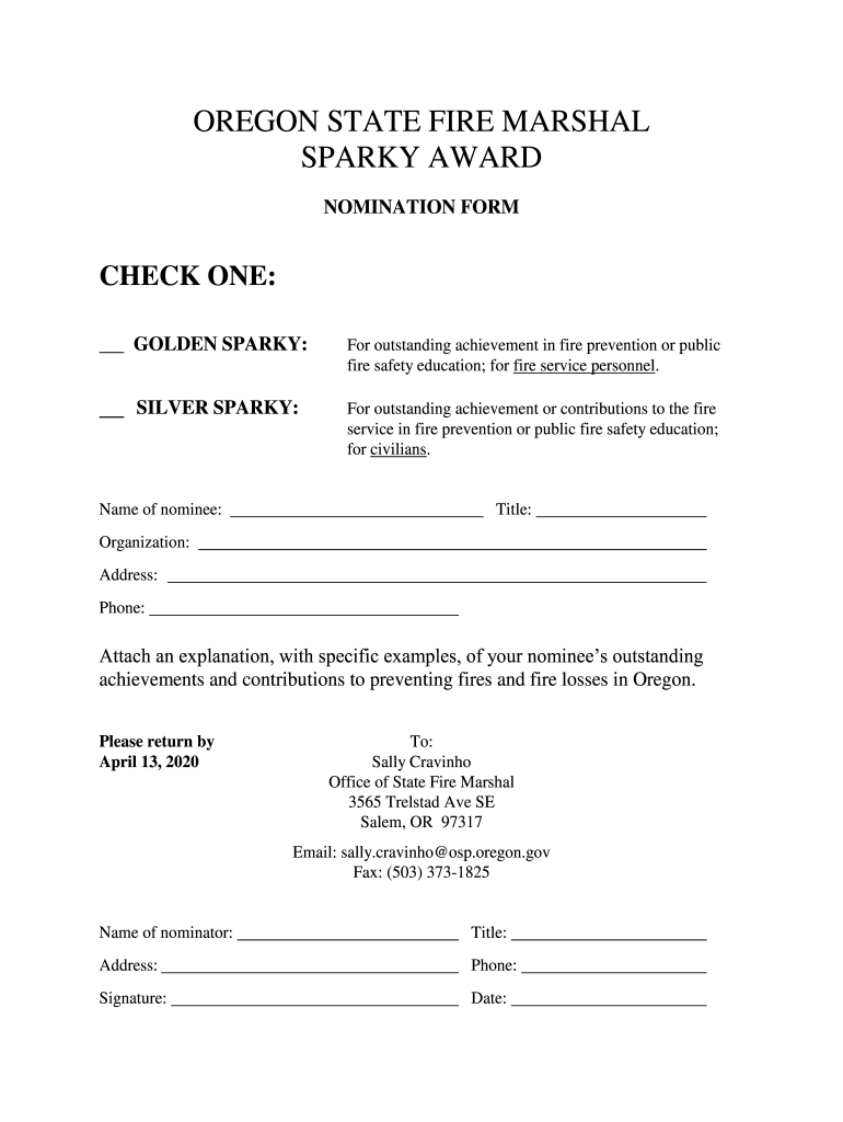 The Sparky Award nomination form is needed by individuals or organizations who want to nominate someone for the Sparky Award. This award celebrates exceptional achievements and contributions made in a specific field or domain. It is open to a wide range of individuals, including professionals, researchers, innovators, and community leaders. By filling out the nomination form, these individuals or organizations can highlight the outstanding accomplishments of someone deserving recognition.