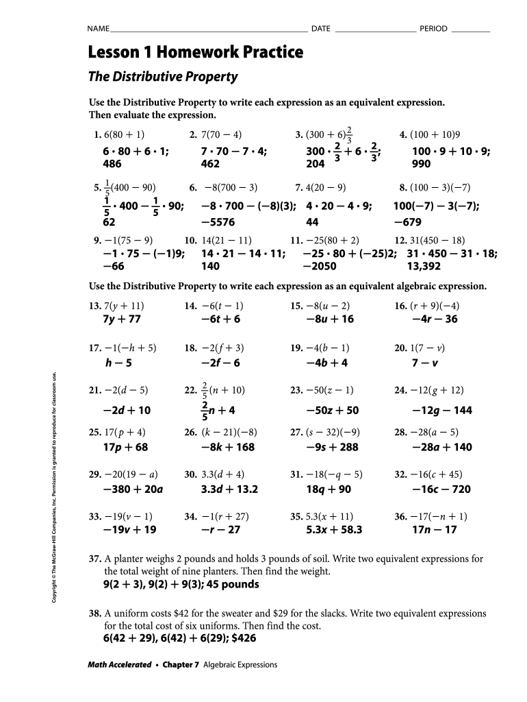 NAME DATE PERIOD Lesson 1 Homework Practice The Distributive Property Use the Distributive Property to write each expression as an equivalent expression. Then evaluate the expression. 1. 6(80 + 1)2.