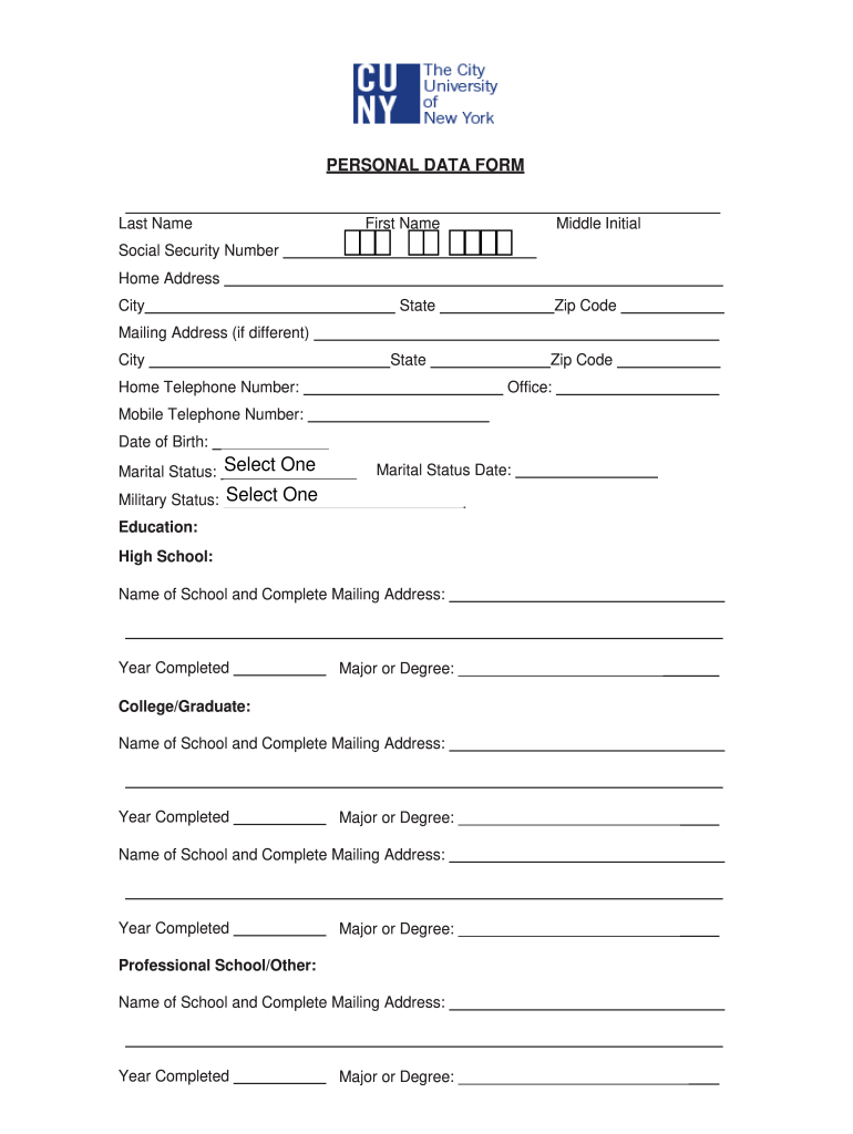 PERSONAL DATA Format NameFirst NameMiddle InitialSocial Security Number Home Address CityStateZip Compiling Address (if different) CityStateHome Telephone Number:Zip Code Office:Mobile Telephone Number: