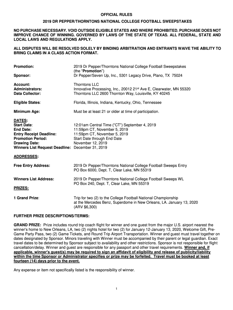 2019 DR PEPPER/THORNTON NATIONAL COLLEGE FOOTBALL SWEEPSTAKES