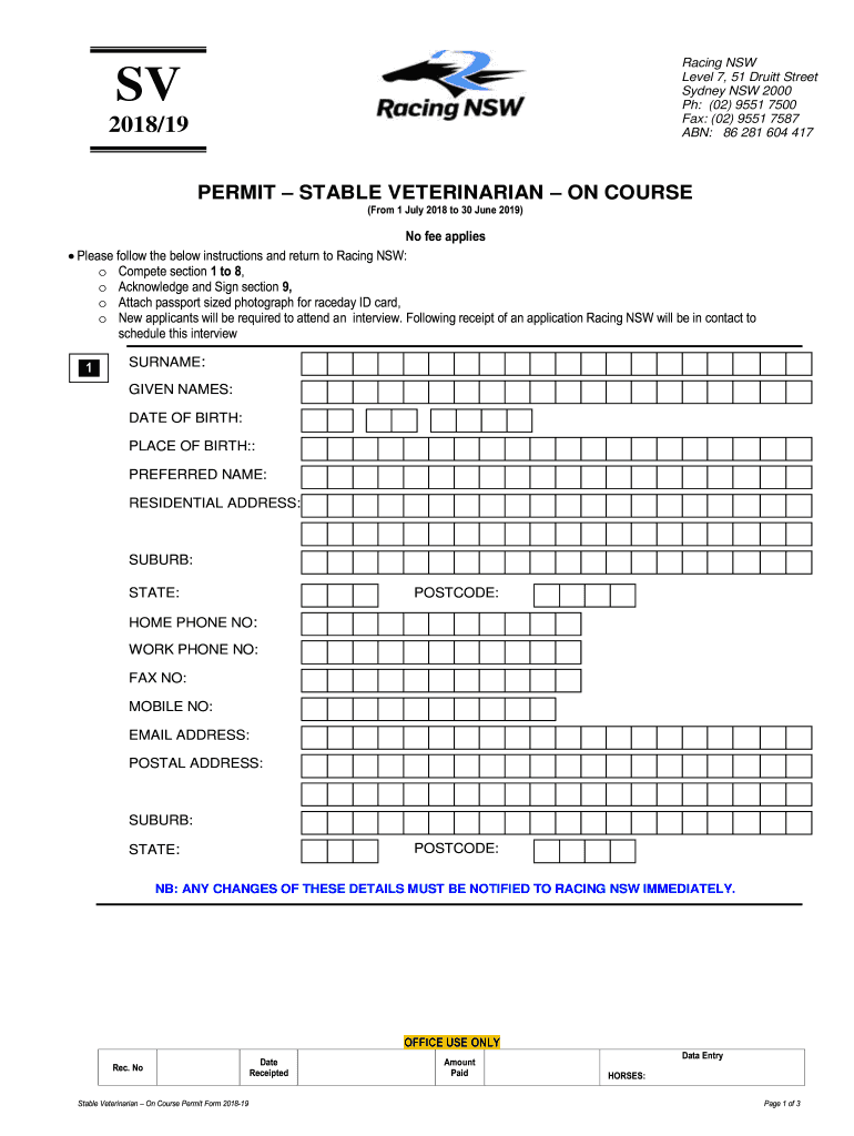Racing NSW Level 7, 51 Pruitt Street Sydney NSW 2000 pH: (02) 9551 7500 Fax: (02) 9551 7587 ABN: 86 281 604 417SV 2018/19PERMIT STABLE VETERINARIAN ON COURSE (From 1 July 2018 to 30 June 2019)No fee
