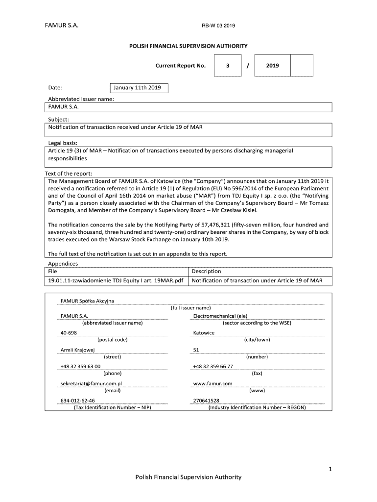 Get the free Notification of transaction received under Article 19 of ... - Famur