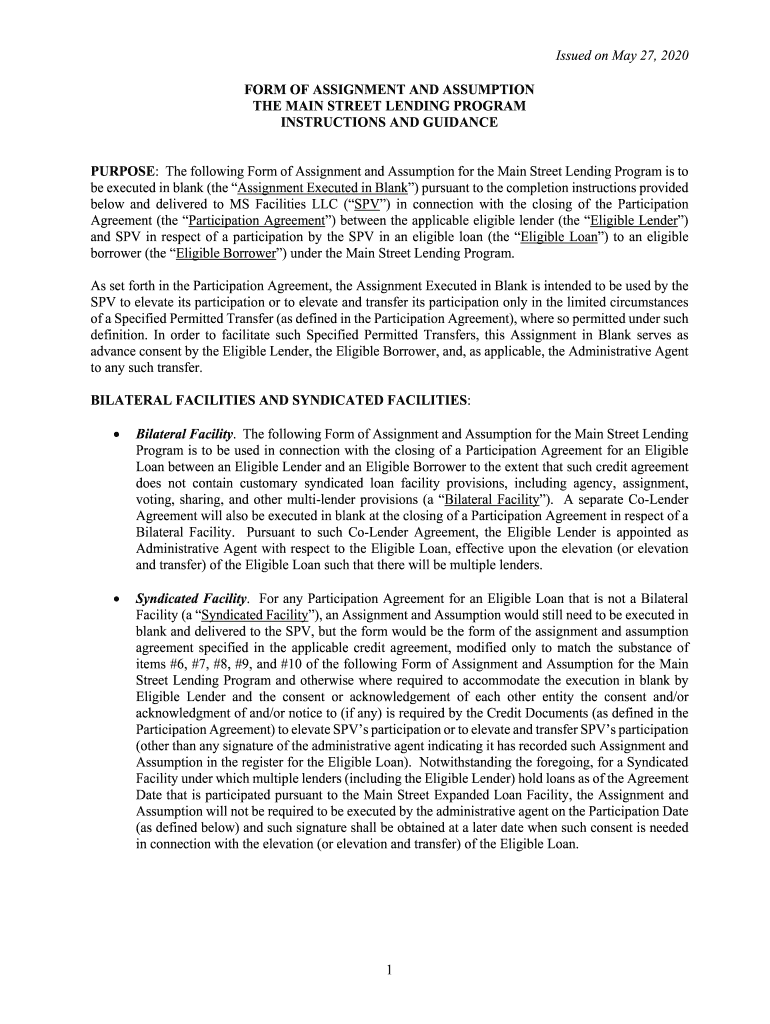 PURPOSE: The following Form of Assignment and Assumption for the Main Street Lending
