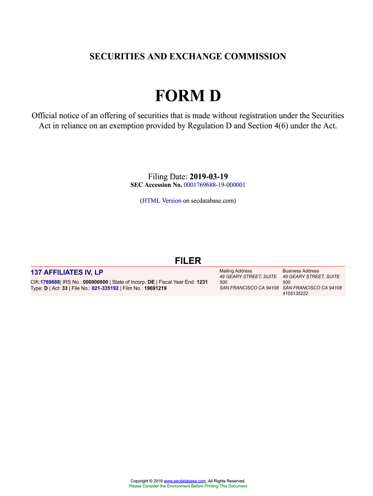 Get the free 137 AFFILIATES IV, LP Form D Filed 2019-03-19. Accession Number