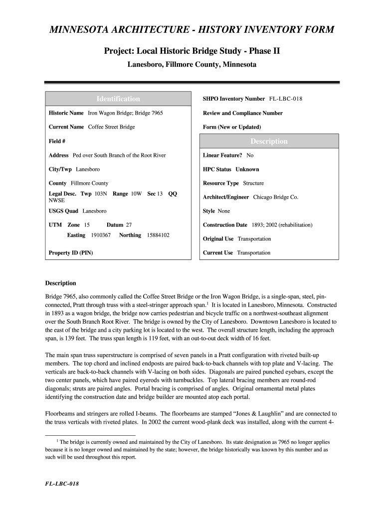 MINNESOTA ARCHITECTURE HISTORY INVENTORY FORM Project: Local Historic Bridge Study Phase II Waynesboro, Fillmore County, MinnesotaIdentificationSHPO Inventory Number FLLBC018Historic Name Iron Wagon