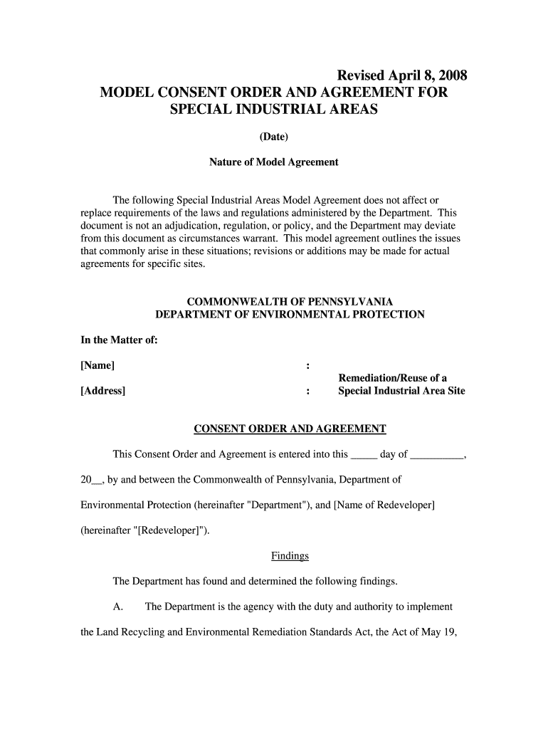 MODEL CONSENT ORDER AND AGREEMENT FOR