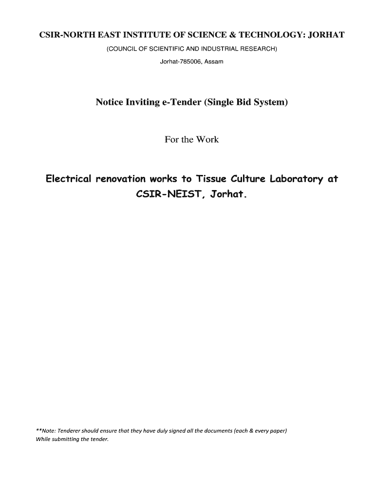 CSIRNORTH EAST INSTITUTE OF SCIENCE & TECHNOLOGY: FORMAT (COUNCIL OF SCIENTIFIC AND INDUSTRIAL RESEARCH) Jorhat785006, AssamNotice Inviting tender (Single Bid System)For the Nonelectrical renovation